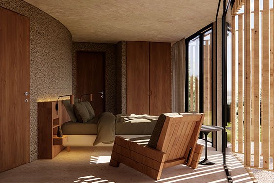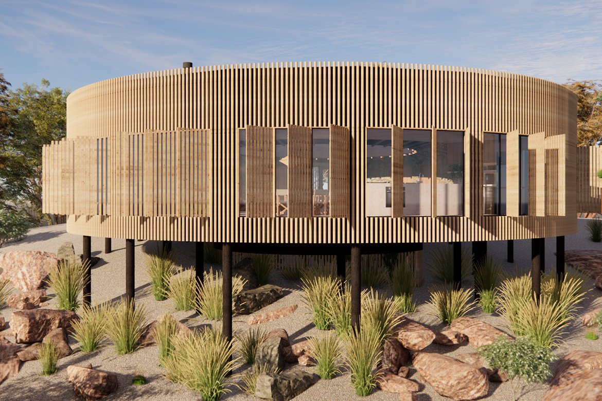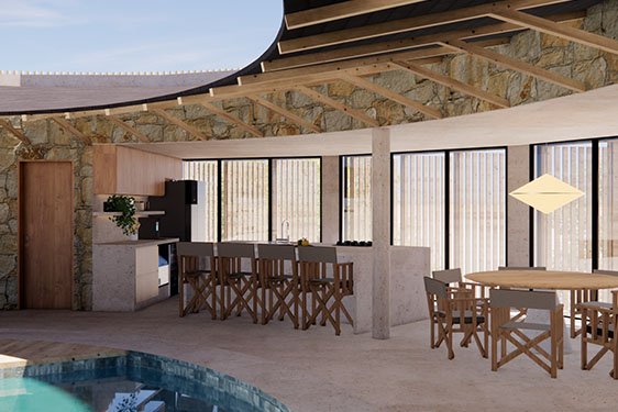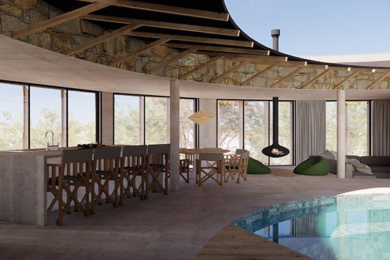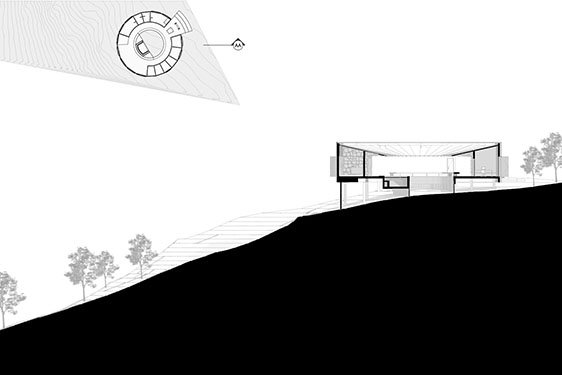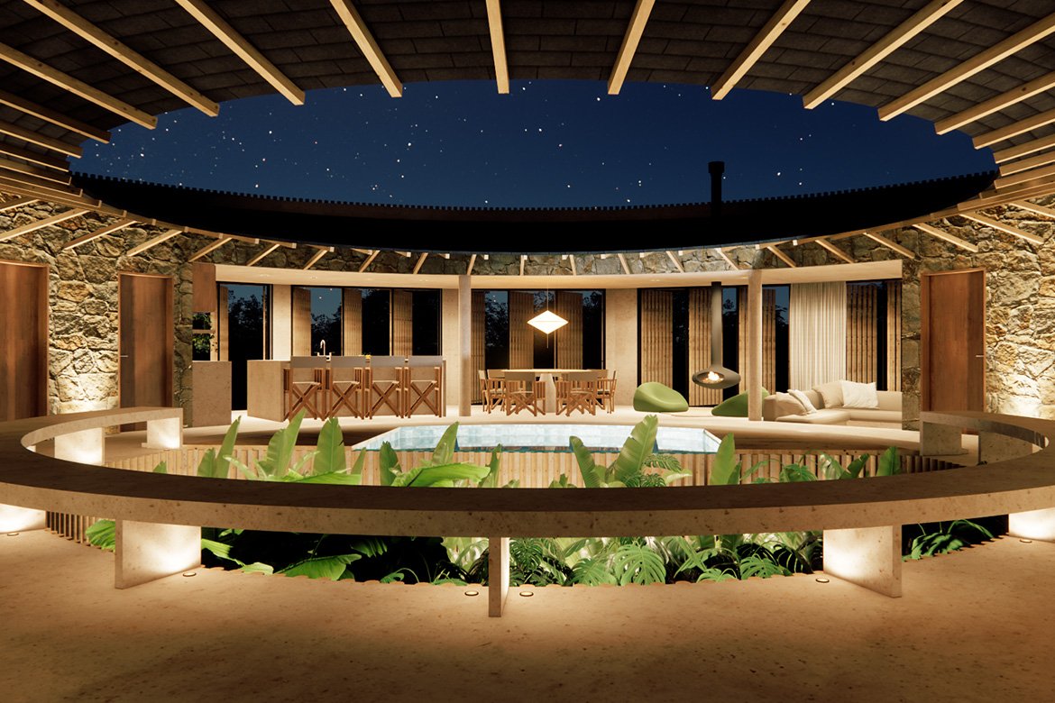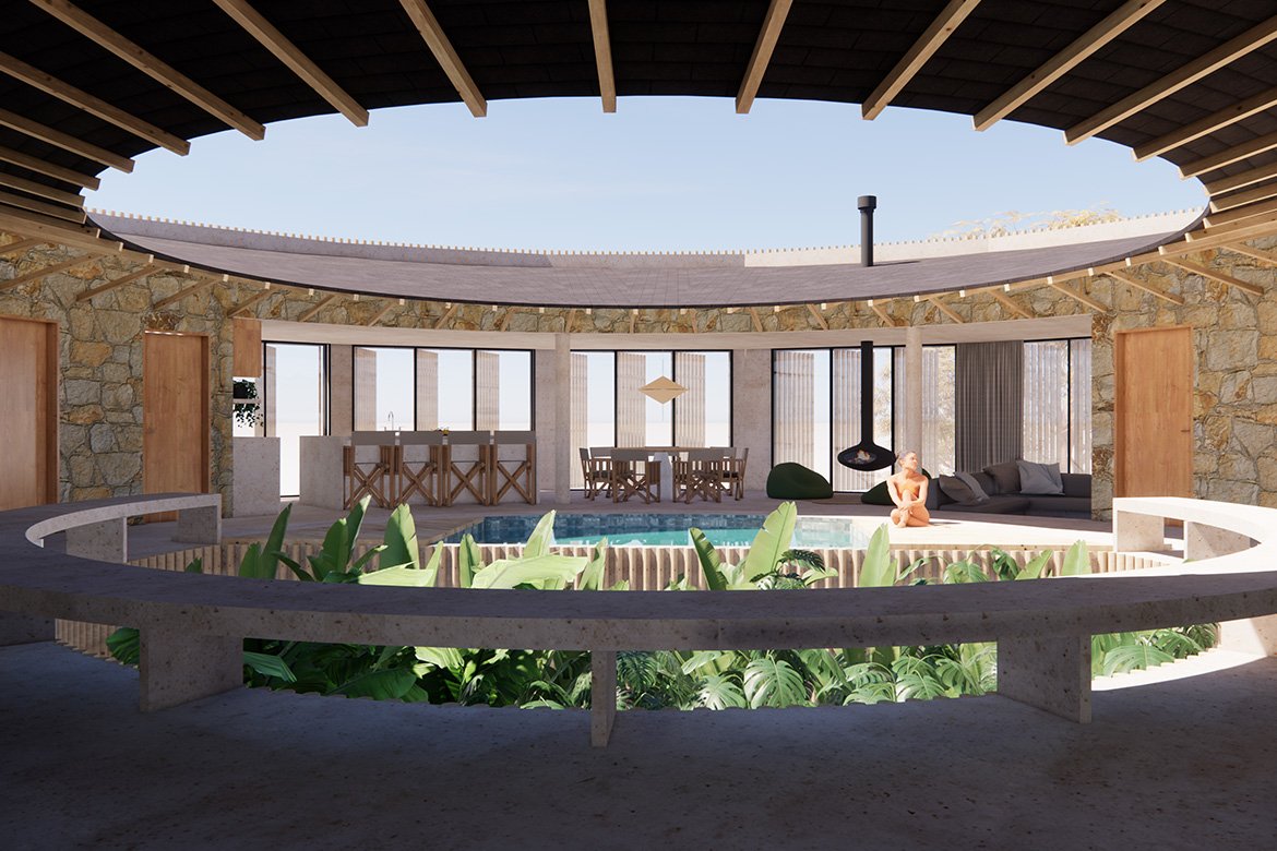 Com 220m², sua arquitetura em formato circular e piso elevado respeita a topografia inclinada do terreno. No centro da casa, um amplo vão aberto convida a vegetação nativa a fazer parte do cotidiano, dissolvendo os limites entre interior e exterior.